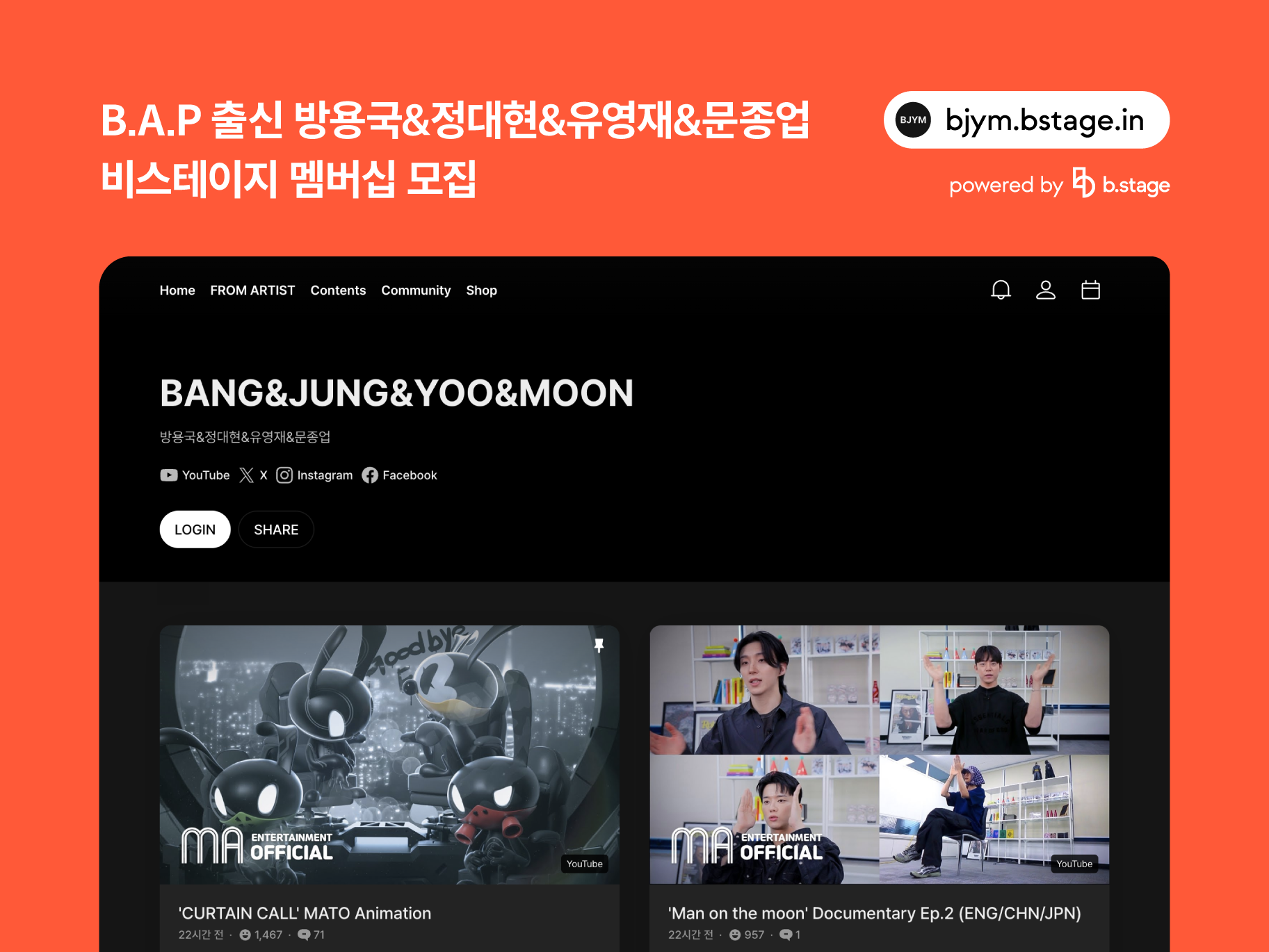 2024년 7월 11일 (목) - 팬덤 비즈니스 토탈 솔루션 ‘비스테이지(b.stage)’가 그룹 ‘방용국&정대현&유영재&문종업(BANG&JUNG&YOO&MOON)’의 글로벌 팬덤 비즈니스를 지원한다. 비스테이지는 공식 홈페이지 구축부터 공식 멤버십 모집까지 방용국&정대현&유영재&문종업의 성공적인 컴백 활동을 위한 토탈 솔루션을 제공할 계획이다.