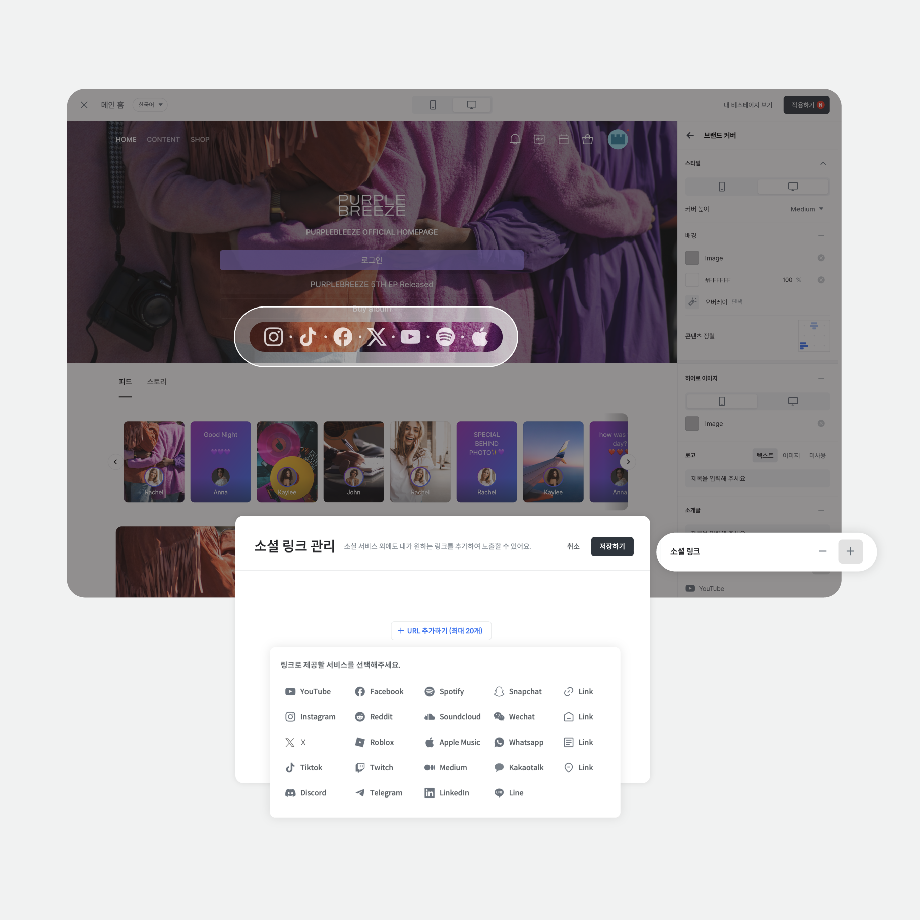 - 메인 홈에 외부 SNS(소셜 미디어)를 최대 20개까지 연결할 수 있어요.
