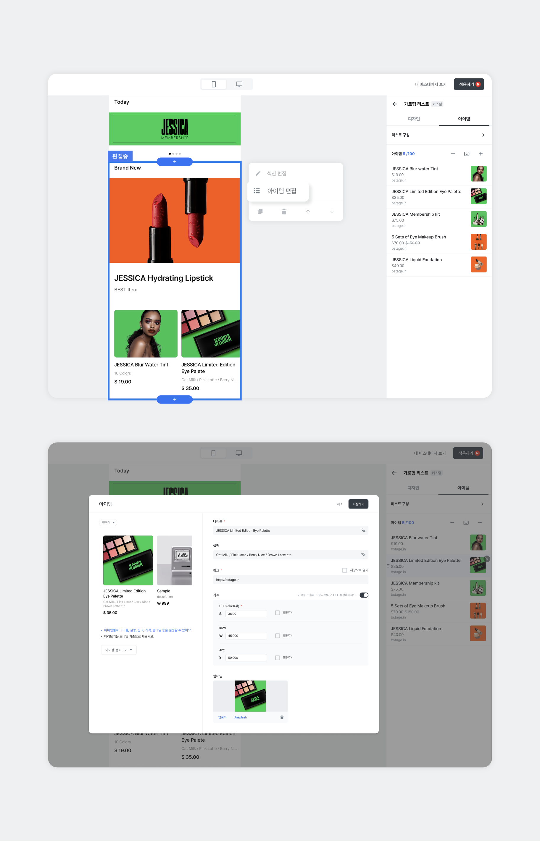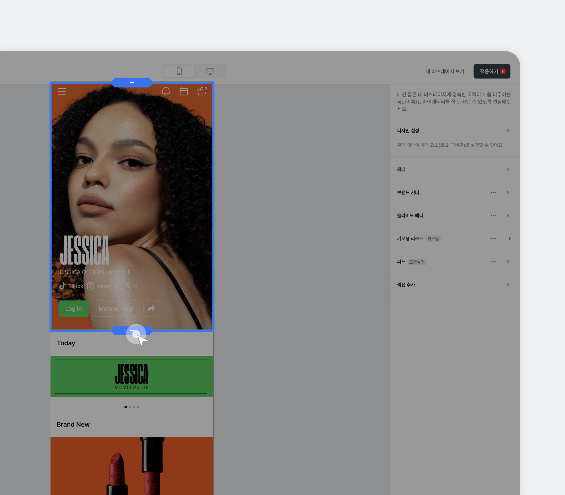 그리고 이 숍(SHOP)의 상품들을 ‘브랜드 커스텀’으로 비스테이지 전면에 전시해 보세요.
