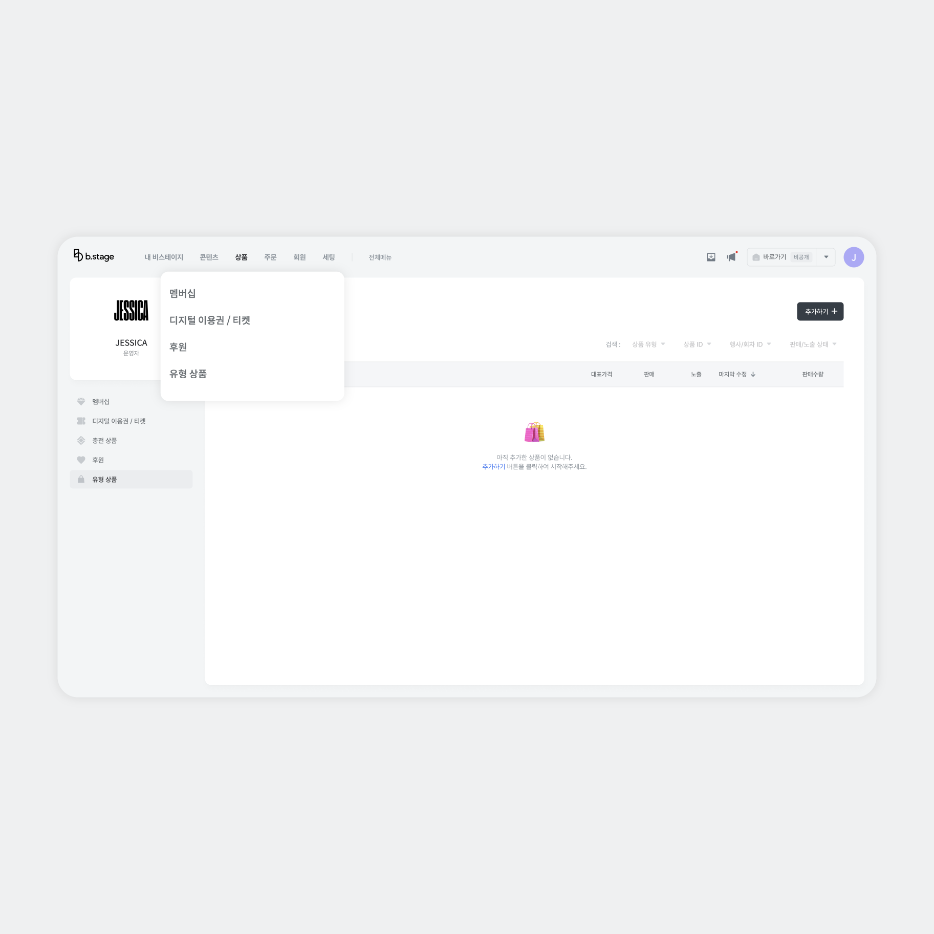 관리자 페이지 [상품]에서 멤버십, 디지털 이용권/티켓, 후원, 유형 상품을 추가하세요.