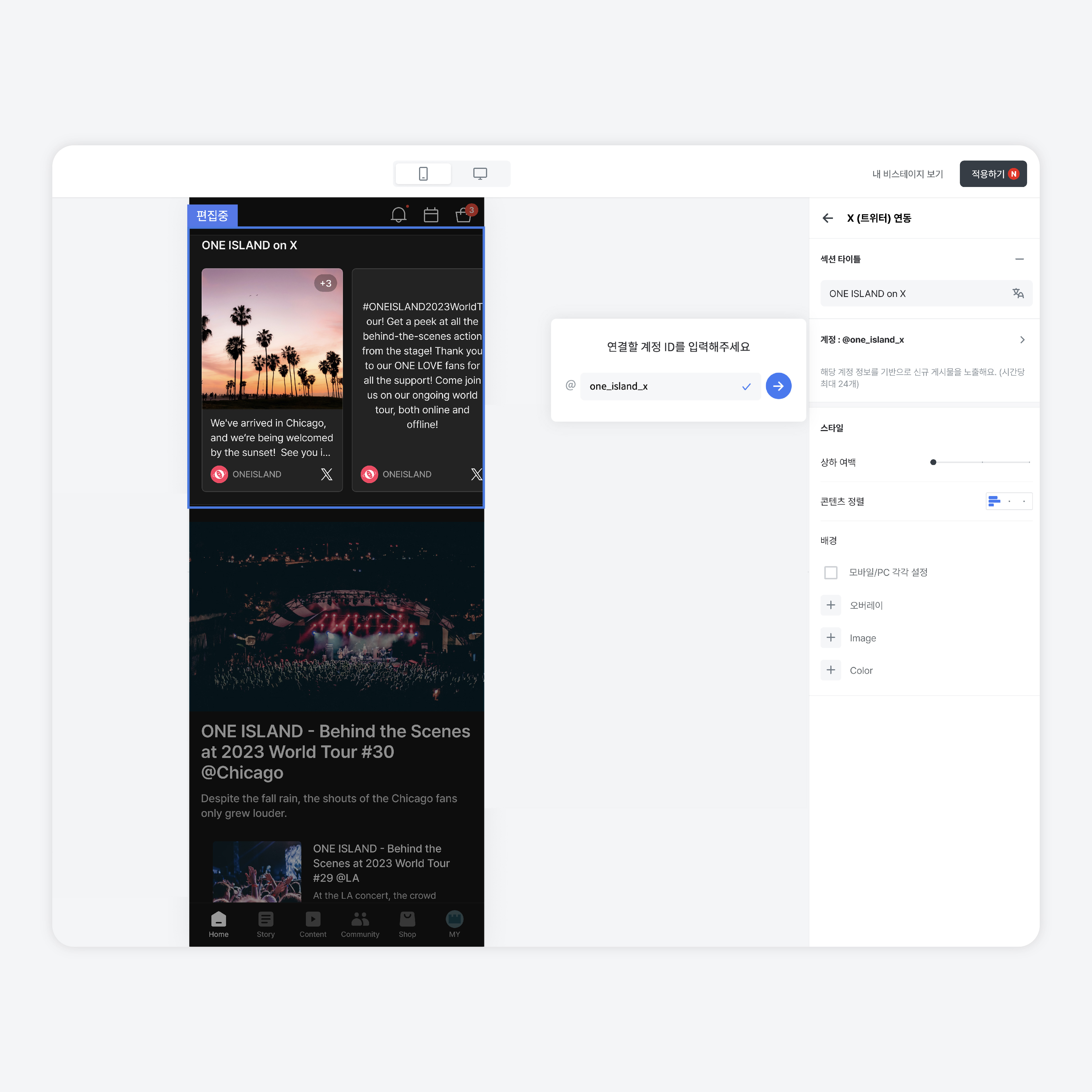 비스테이지 메인 홈에서 X 연동을 확인해 보세요. 본 계정을 통한 게시(Post) 뿐 아니라 다른 계정의 포스트를 재게시(Repost), 인용(Quote)할 경우에도 위젯에 반영돼요.